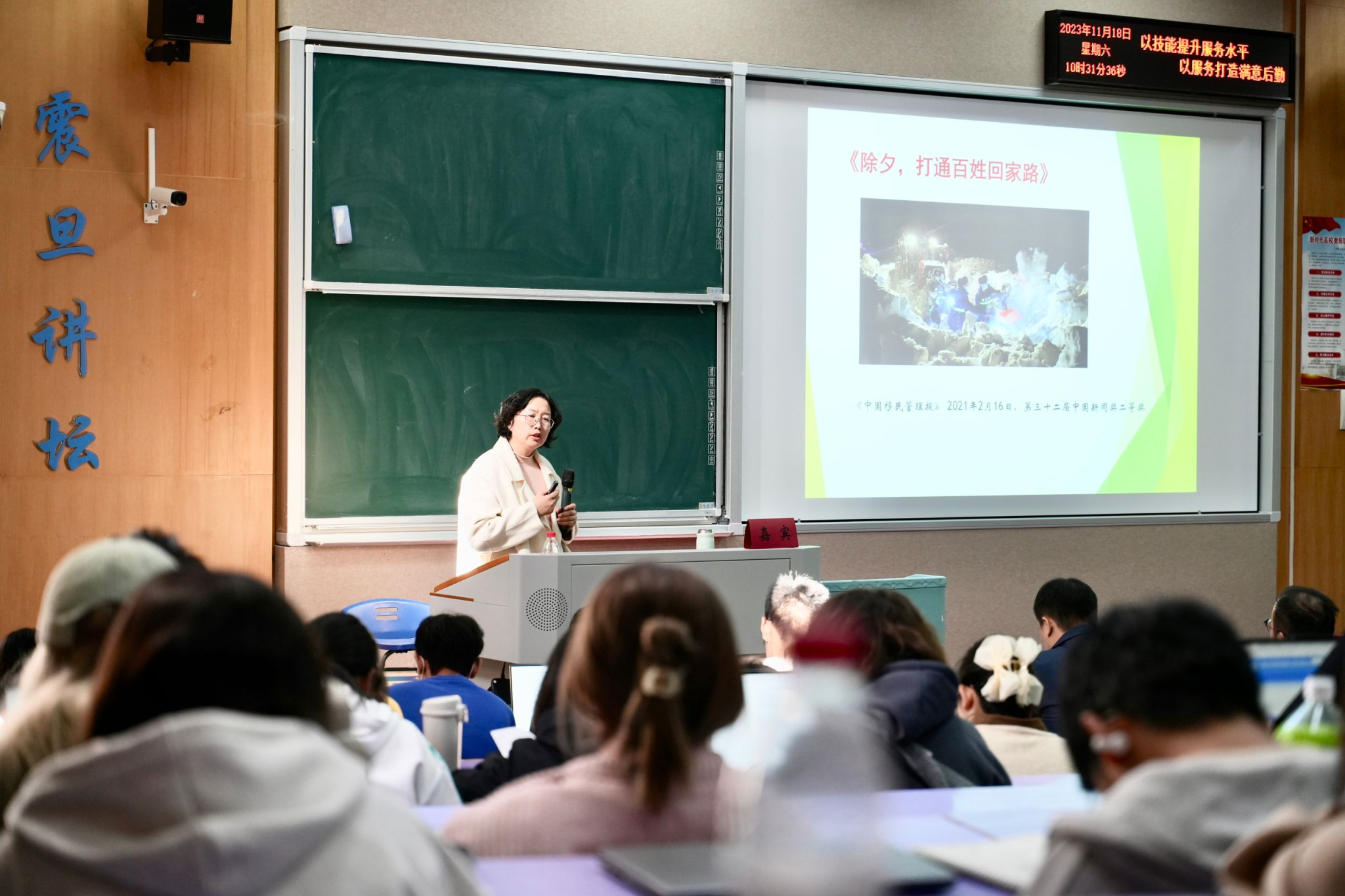 校图书档案与文博部徐燕老师开展了题为《掌握写作技巧,讲好地大故事》的写作专题培训。徐老师结合自己多年的写作经验,分享了写作中的注意事项,然后从标题、首段、语言、内容等角度进行新闻稿写作规范指导。