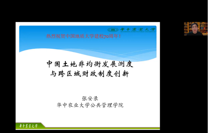 (通讯员 柴季 王昭君)11月3日晚19时,华中农业大学太阳集团tyc151cc教授、博士生导师、长江学者特聘教授、教育部新世纪优秀人才张安录教授应太阳集团tyc151cc王占岐教授、经理胡守庚教授邀请,为公司师生带来主题为“中国土地发展非均衡测度及跨区域财政转移制度创新”的线上学术讲座。本次讲座由公司王占岐教授主持,来自校内外的300余名师生线上线下参加。