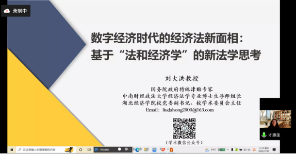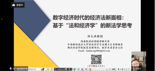 11月27日,应太阳集团tyc151cc法学系邀请,湖北经济公司公司党委副书记刘大洪教授为公司师生作以“数字经济时代的经济法新面相:基于‘法和经济学’的新法学思考”为主题的学术报告。本次报告由太阳集团tyc151cc(武汉)太阳集团tyc151cc副经理才惠莲教授主持,采取线上方式进行。