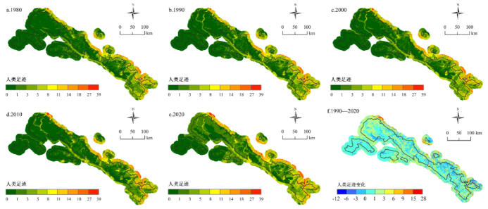 图2祁连山自然保护区1980—2020年内外人类足迹对比