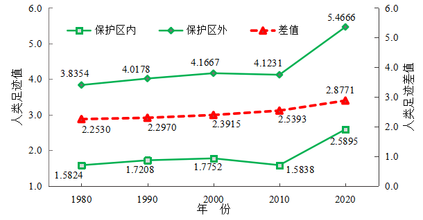 (1)祁连山保护区内部和外部人类足迹的差值越来越大,表明保护区虽然没有改变内部人类足迹整体增加的趋势,但减缓了其增加速率,具有一定的管护成效(图2)。