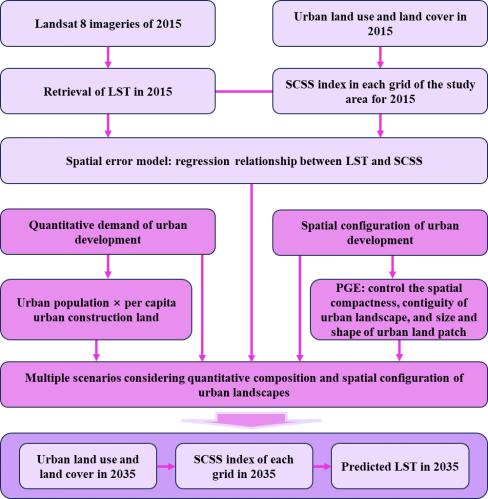 城市化进程加速加剧了热岛效应问题,如何通过城镇土地利用景观格局对热岛效应进行预测与有效管理,尤其是如何同时考虑城市景观的数量组成、空间布局、连通性及热特性进行地表温度的模拟与分析,是指导城市规划和制定绿化政策的重要问题。