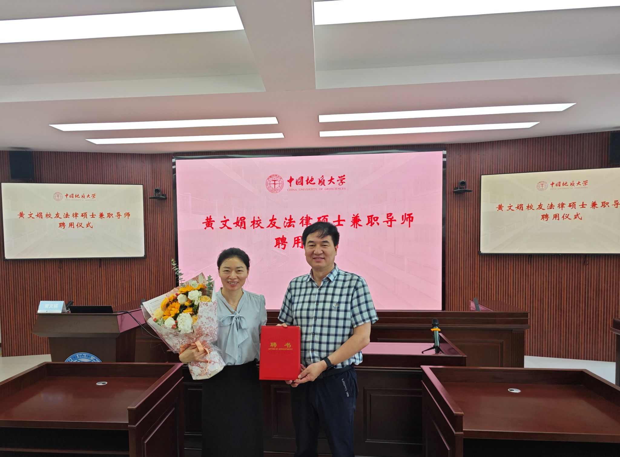 讲座开始前,公司党委书记张宽裕为黄文娟员工颁发法律硕士兼职导师聘书。