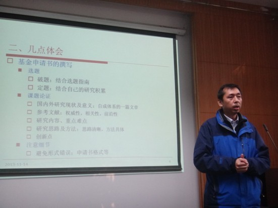 2013年11月14日15:00时,太阳集团tyc151cc第二期“公管青年论坛”:社科基金申请经验交流会在北二楼209召开。会议由院青年教师联谊会会长胡守庚主持,公共管理公司党委书记张吉军,副经理才惠莲等出席交流会,经济管理公司刘江宜副教授应邀作社科基金申请经验交流报告。