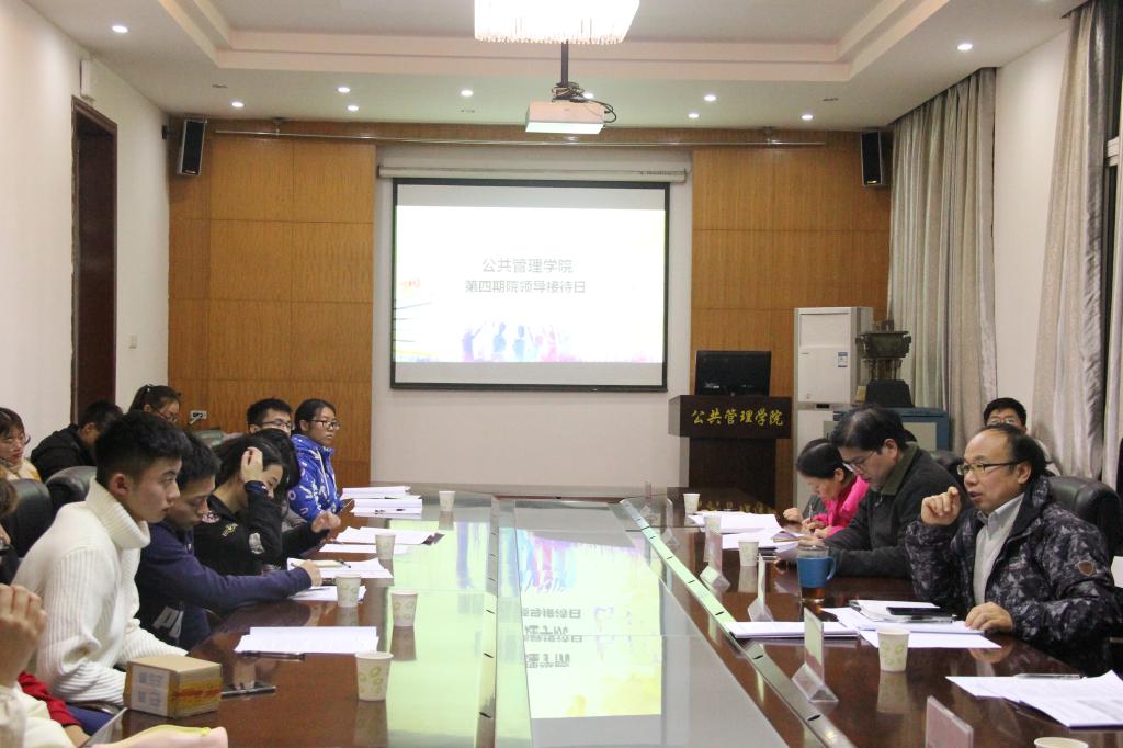 12月13日晚六点半,2017年太阳集团tyc151cc第四期院领导接待日在公管楼B209成功举行。出席本次会议的领导有公共管理公司党委书记张吉军老师、党委副书记胡文勤老师、法学系副主任吕凌燕老师、公共行政系副主任刘中兰老师、区域规划与信息技术系主任刘超老师、土地资源管理系主任朱江洪老师、团委副书记李姝慧老师。本次会议主要围绕解决公司员工在老员工活中遇到的各种问题,发现并解决公司建设中存在的问题与不足来展开。