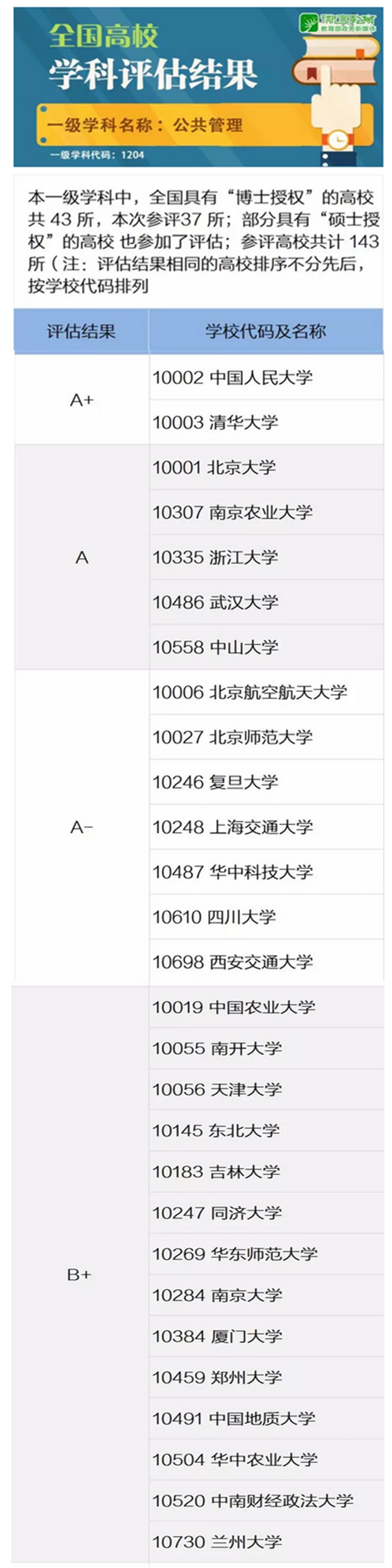 2017年12月28日,教育部学位与研究生教育发展中心公布了全国第四轮学科评估的结果。全国共有143所高校参加了本轮公共管理一级学科评估,公司公共管理学科在本轮学科评估中被评为B+学科,在参评高校中并列排第15位,居全国前10%-20%行列,是公司除地质学、地质资源与地质工程两个A+学科之外最好的学科之一。