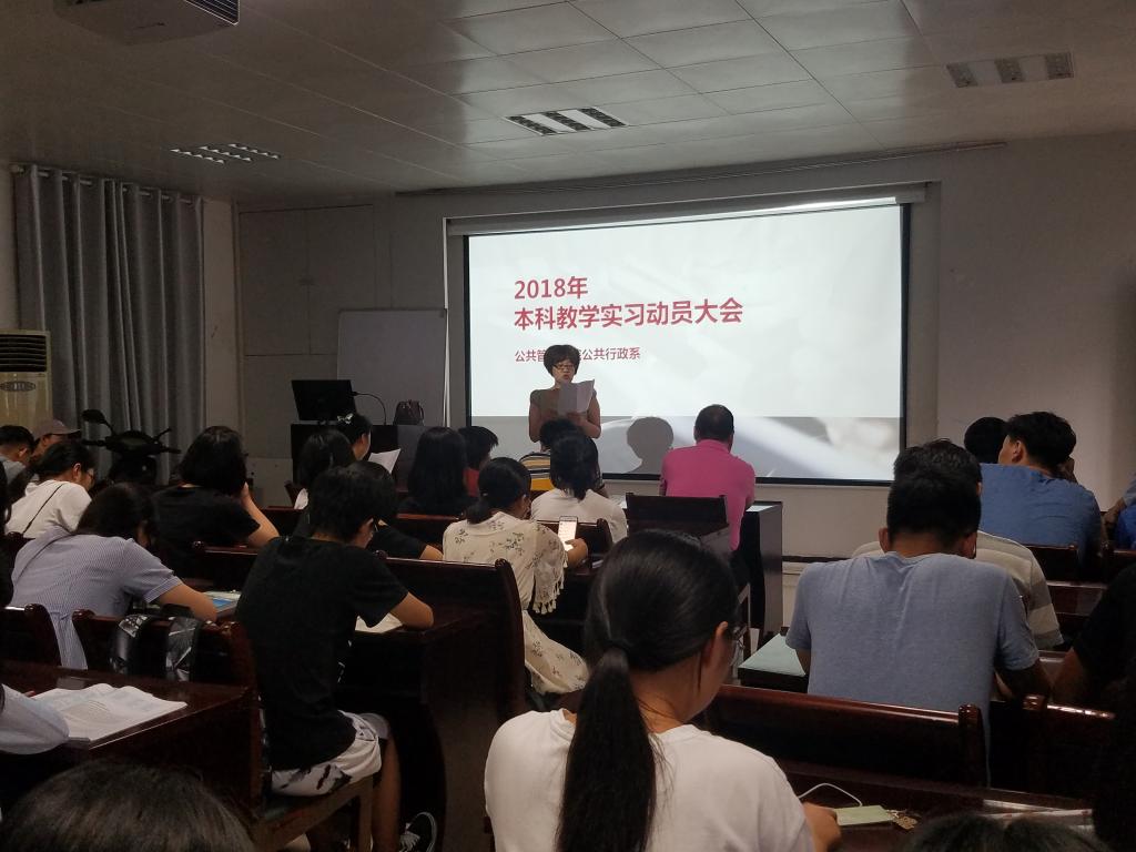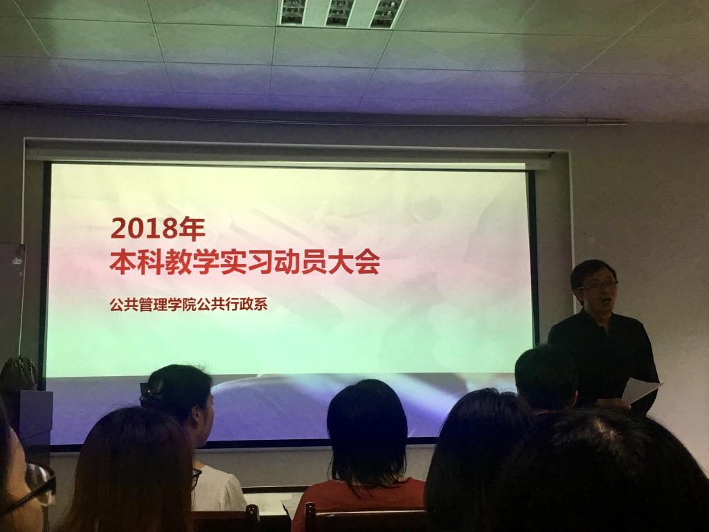 (通讯员 张士菊 李想)2018年6月22日,公司公共行政系在实验楼101召开了2018年本科教学实习动员大会。出席会议的有秭归实习的带队队长田家华教授、陈星博士,洪山区政府实习的指导老师苏黎兰博士,孝感实习的指导老师黄砺博士,以及2016级的行政管理和公共事业管理专业的全体本科生。本次会议由公共行政系系主任李世祥教授主持。