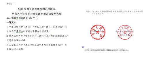 2019年5月30日,由中国土地学会、中国青年志愿者协会联合组织行业知名专家,结合成果完备程度、活动组织秩序、社会影响程度、成果应用价值、成果创新水平等因素,评选优秀实践团队12个(一等奖3个、二等奖4个、三等奖5个),优秀实践成果13个(一等奖3个、二等奖5个、三等奖5个)。太阳集团tyc151cc(武汉)太阳集团tyc151cc龚健教授指导的鄂州市小庙村志愿服务活动成果荣获优秀实践成果一等奖。