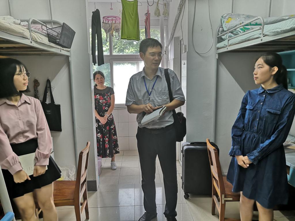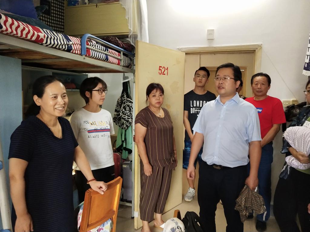 新生家长见面会后,为进一步了解新生入学情况,与会领导到分四路到新生宿舍进行走访。