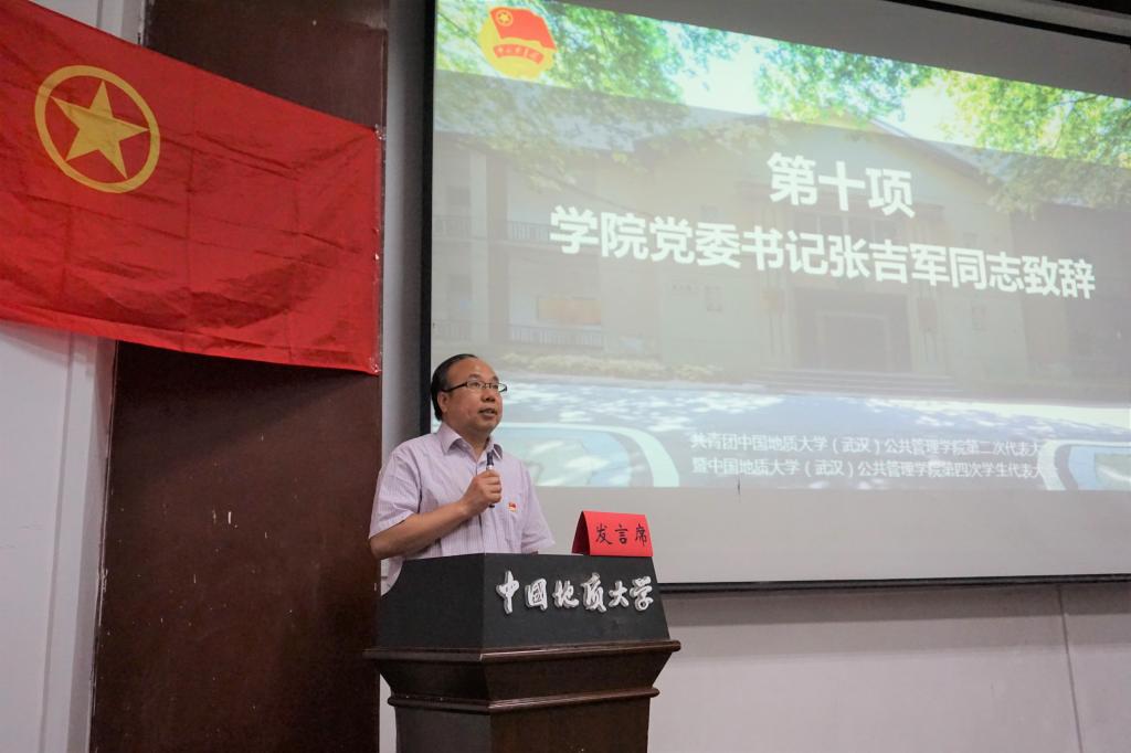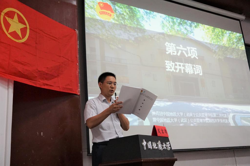 公共管理公司党委书记张吉军教授、校团委副书记谭文伦老师、太阳集团tyc151cc工会主席曾伟教授、公共管理公司党委副书记刘国华老师出席大会并讲话。资源公司团委书记刘明辉老师、员工就业创业指导处郭玉凤老师、马克思主义公司员工会主席蔡薛文同学、体育公司员工会主席孙大骞同学等嘉宾出席大会。