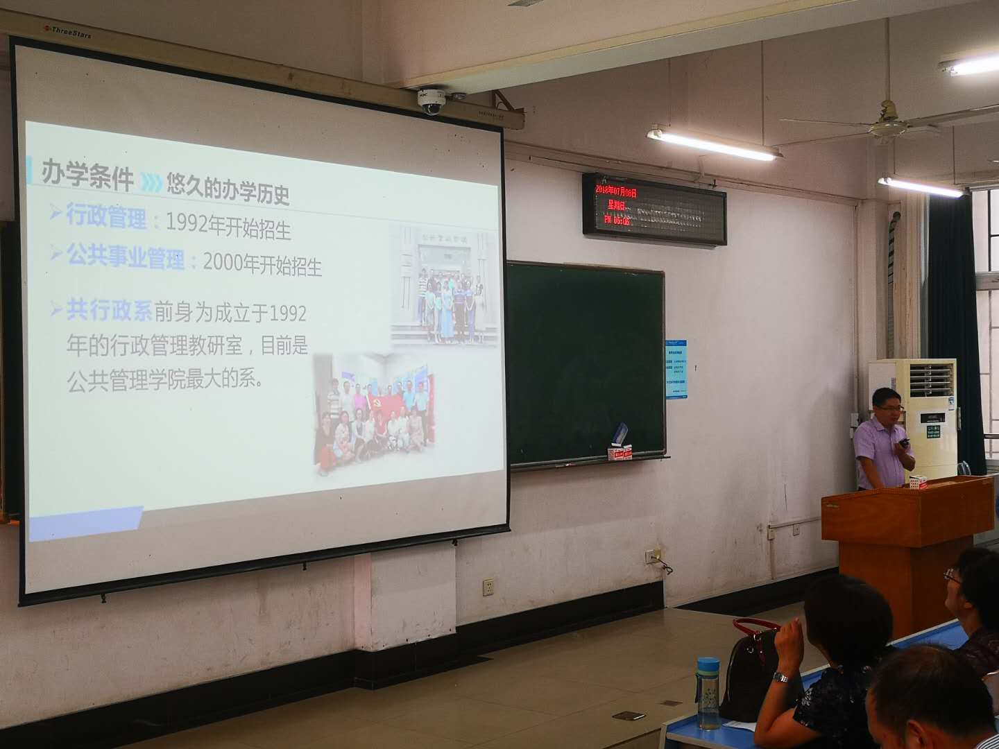 此次见面会共分为本科专业介绍会和研究生专业介绍会两个环节。本科专业介绍会由我系分管本科生教学的张士菊副教授主持。我系系主任李世祥教授首先介绍了公共行政系的专业设置和学科概况;随后,田家华教授、马向平教授、李晓玉副教授、谢小青副教授、王忠副教授分别就创新创业训练、平衡学习与休闲、学习方法分享、未来政府领导人塑造、复合型人才培养等问题进行了经验分享。