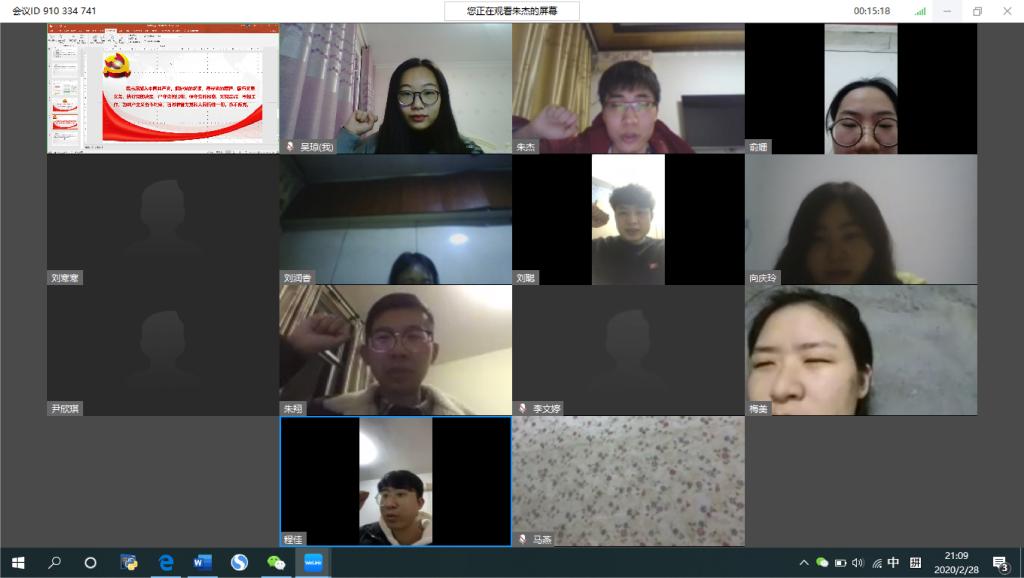 支部书记朱杰同学组织各位党员、团员认真学习了习近平总书记关于疫情防控工作的重要讲话以及中共中央、湖北省纪委机关、湖北省委组织部有关文件精神,在此基础上了解各地方政府和单位的准确判断、决策以及创新性的防疫举措,促使支部成员意识到作为一名员工党员、青年团员的责任与使命,勇于担当,坚定信念,严于律己,充分发挥先锋模范作用,为打赢疫情防控阻击战提供坚强的政治保证。