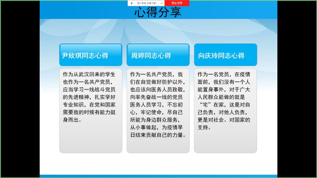 预备党员梅美同学分享了广大党员、干部、医务工作者冲锋在前、顽强拼搏,在抗击疫情的战斗中涌现出的一大批先进人物和典型事迹,如17年前奋战在抗击非典型肺炎一线的钟南山院士再次奔赴武汉;武汉金银潭医院经理张定宇,拼了性命与死神争分夺秒抢救病人;29岁的武汉市江夏区第一人民医院呼吸与危重症医学科医生彭银华,在疫情面前延迟婚期主动请战;红旗社区普通居民董继萍把人民群众的身体健康和生命安全放到第一位。这样的模范还有很多,虽然我们不能记住每一位“逆行者”的面容与名字,但我们会永远记得举国上下团结一致、共克时艰的力量。