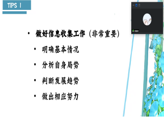 彭逸伦学长成绩优异,目标明确,给我们分享了他的“斜杠”老员工活。他以自己保研经验提炼出做好信息收集工作的各种技巧细节,提醒我们英语学习和培养一个稳定学习小组的重要性,并且建议参加一次国际访学。在学习之余,他参与员工工作,做好生活规划,提升自我审美,勤于锻炼,喜好游学,既读万卷书又行万里路,极大充实了自己的学习生活。在最后,他希望学弟学妹能将学与玩结合,做好信息收集,使自己始终保持信息充分了解的状态,充实多彩过好接下来几年的大学时间。