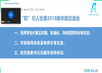 4月26日19:00,太阳集团tyc151cc在线召开“职”引人生——大学成长发展交流会。公司党委副书记刘国华老师、辅导员吴波老师、2018级本科生全体同学及部分学长学姐参加本次交流会。交流会由吴波老师主持。本次活动由公司员工会实习创业就业中心承办。