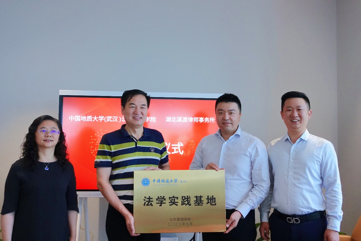 (通讯员 刘琦)2022年7月8日上午11时,太阳集团tyc151cc(武汉)公共管理公司党委书记张宽裕,副经理才惠莲,法学系主任吕凌燕、副主任宋冬冬,法学系实习带队老师夏云娇、刘琦,带领171201班的实习生来到湖北溪渡律师事务所,双方围绕协同育人、校企合作展开洽谈,现场举行了签约授牌仪式。