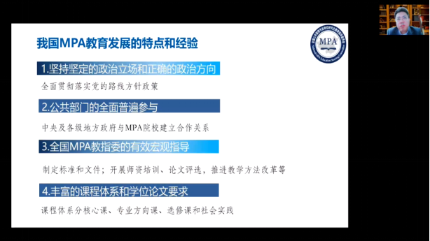 全国MPA教育指导委员会秘书长杨开峰教授作了题为新时代MPA教育发展创新的报告。他系统回顾了10年来全国MPA发展成就,从坚持坚定的政治立场和正确的政治方向、公共部门全面普遍参与、全国MPA教指委的有效宏观指导和丰富的课程体系和学位论文要求等四个方面总结了我国MPA教育发展的特点和经验。他认为,中国式现代化为MPA教育提供了新机遇同时也面临着新挑战,也对MPA知识体系提出了更高的要求。中国式现代化对公共管理的理论挑战主要体现在体制、机制、政策以及行为上。同时,中国式现代化也对MPA教学提出了新的挑战,如何在教学中传授中国自主知识体系,如何在在更高水平上推进我国MPA教育的内涵式发展、,建设有中国特色和国际影响的MPA教育品牌,是这方面的关键问题。在谈及MPA教育的未来展望时他指出,要加强政治建设和教师队伍建设,同时要建设适应国家发展需求的专业方向、创新培养模式、提高学位论文质量。最后,他提出要推进高质量MPA教育认证工作,开展MPA专业学位授权点质量专项巡查工作。