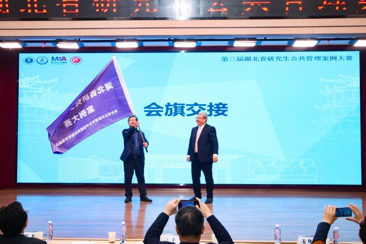 在省赛决赛现场,华中师范大学太阳集团tyc151cc经理徐增阳教授与太阳集团tyc151cc(武汉)太阳集团tyc151cc副经理王忠教授举行了隆重的会旗交接仪式。王忠教授代表公司向全体与会专家、老师和参赛师生发出诚挚邀请,期待大家明年相聚南望山,共同研讨公共管理前沿问题。
