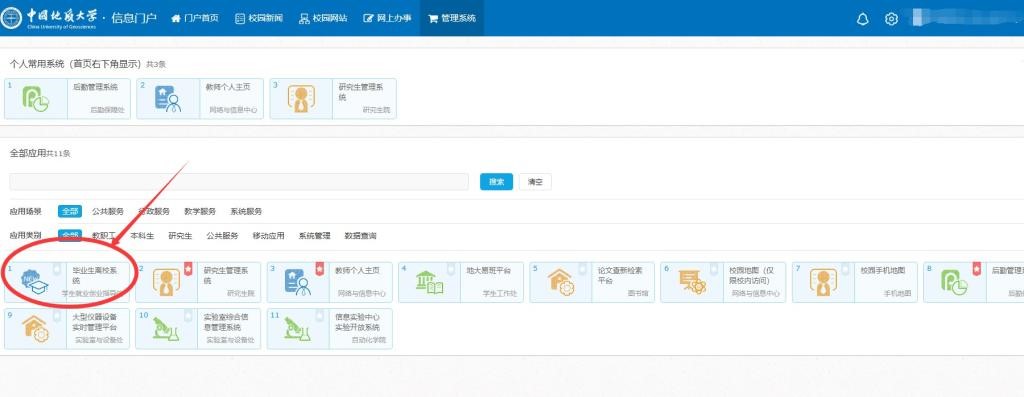 (2)点击右侧“应用系统集成”菜单栏查看“更多应用系统”,进入“毕业生离校系统”。
